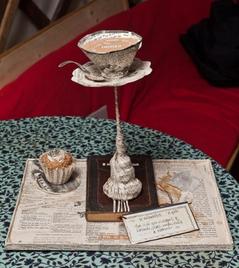 This sculpture includes a a tag that reads: “By leaves we live.” The cup on the top has a swirl of words that reads: “Nothing beats a nice cup of tea (or coffee) and a really good BOOK”. Finally, the tray near the cupcake reads: “Except maybe a cake as well”.