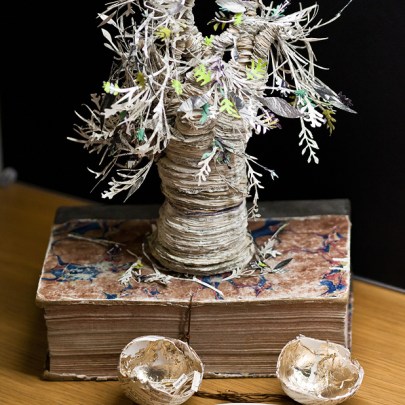 The first sculpture delivered was named “The Poetree” after Librarian Julie Johnston discovered it in the Scottish Poetry Library. At the base is a broken egg with words from Edwin Morgan’s poem, “A Trace of Wings.”