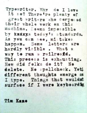 Typewriter. Why do I love it so? There’s plenty of great writers who composed their whole work on this machine. Seems impossible by today’s standards. As you can see, mistakes happen. Some letters are hardly visible. What a way to run a railroad. This process is exhausting. How did folks do it? No delete. No spellcheck. Yet different thoughts emerge as I type. Things that wouldn’t surface if I were keyboarding.