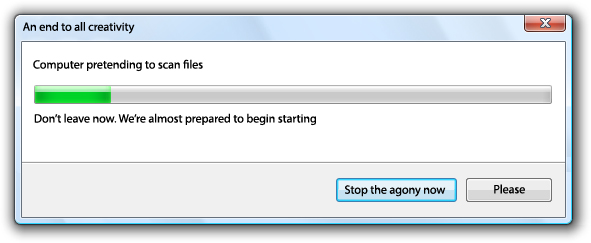 If you’re stuck with something that is technology dependent, I feel for you. No one likes the progress bar. The best advice I can give you is make sure your other outlets (creative or otherwise) don’t rely on batteries, updates, or Internet.