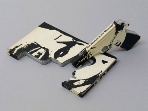 Finally, we have artist Robert The (yes, that’s his name). He takes books and then cuts them up to create new symbols. A lobster. A broom. A cake. And yes, a gun.