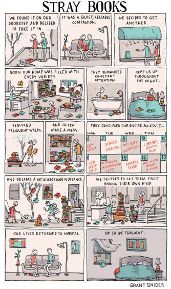 I love everything that has to do with books. Most of my love exhibits itself in clever sayings or aphorisms about reading and books. At incidental comics, I stumbled upon an amazing comic about adopting books. Check out Stray Books: