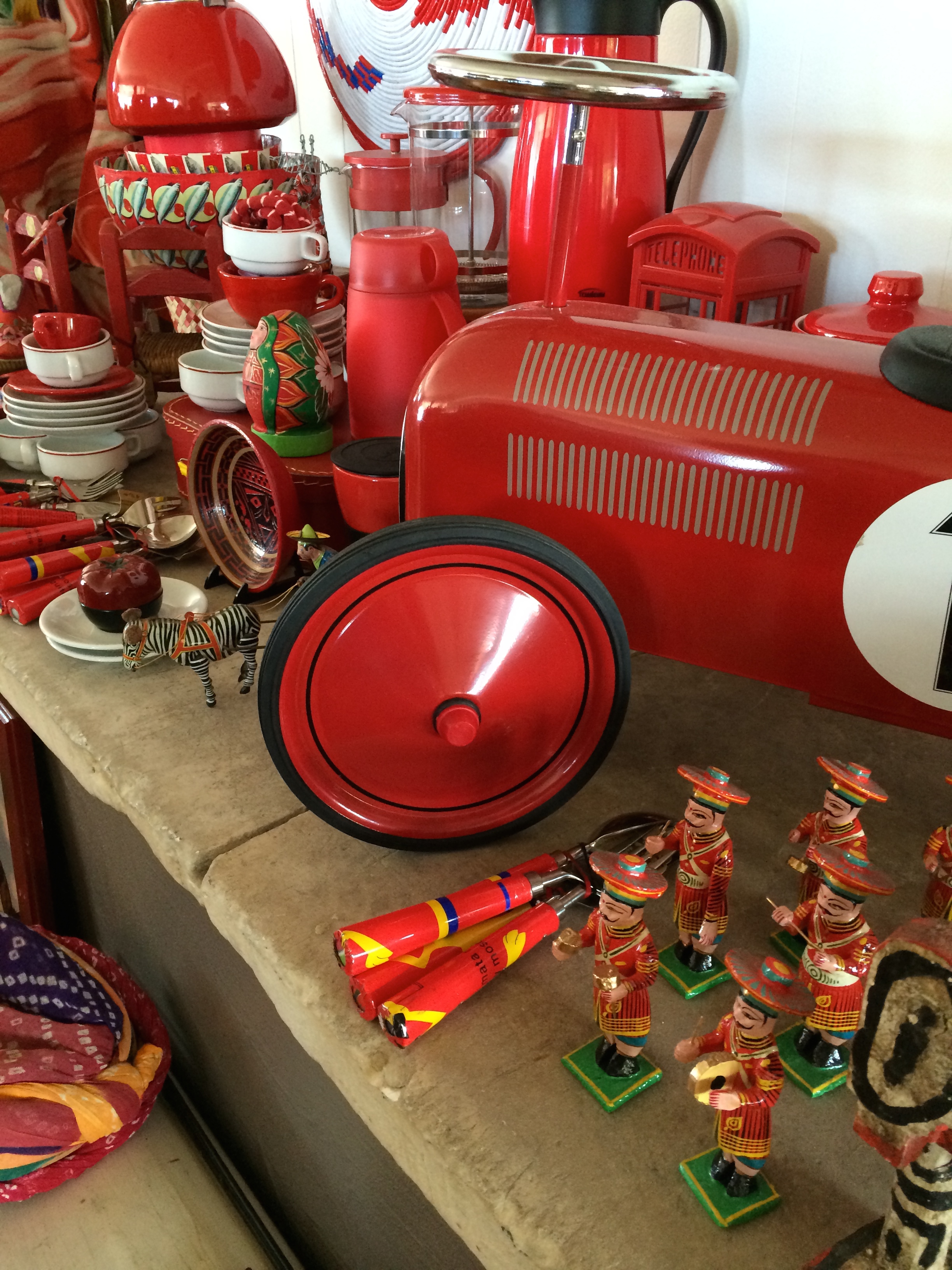 The ladies color code their supplies, so as you walk in, you see walls of color: orange, red, black, green. Sprinkled in between the coffee cups and coffee pots are tin toys, dolls