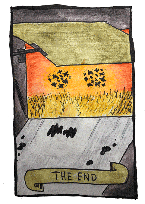 “Soon it won’t matter which card you scamper off to. They’ll all fall down. One by one.” He backed away, face becoming fuzzy and indistinct until vanishing into the orange sky. Only the meadow and a few scattered birds remained.