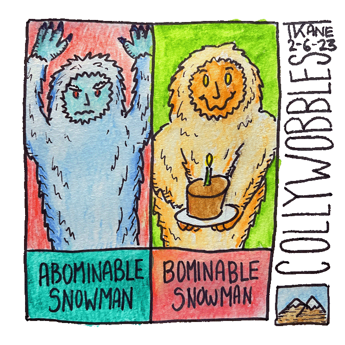 The Abominable Snowman (and Bominable) Feb19 by Tim Kane So if the Abominable Snowman is a creature we all fear, would the Bominable Snowman be a kinder, gentler monster? Tim Kane Share this: Click to share on Pinterest (Opens in new window) Pinterest Click to share on Facebook (Opens in new window) Facebook Click to share on X (Opens in new window) X Click to email a link to a friend (Opens in new window) Email Click to print (Opens in new window) Print Click to share on Reddit (Opens in new window) Reddit Click to share on Tumblr (Opens in new window) Tumblr Like Loading... Related