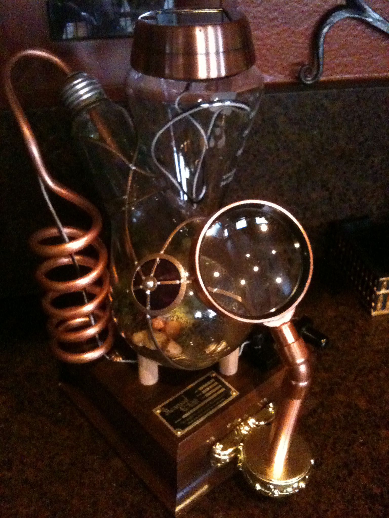 My wife gave this to me for our anniversary. It’s a terrarium made from an extra large light bulb by an outfit called steamed glass. It has plenty to doohickeys to give it the steampunk esthetic, but they don’t do much. The only one that is functional is a knife switch that controls a little light inside. The light is linked to a light sensor and turns on when it gets dark. This type of plant is perfect for me because I often forget to water, and subsequently I have many shriveled and dying foliage.
