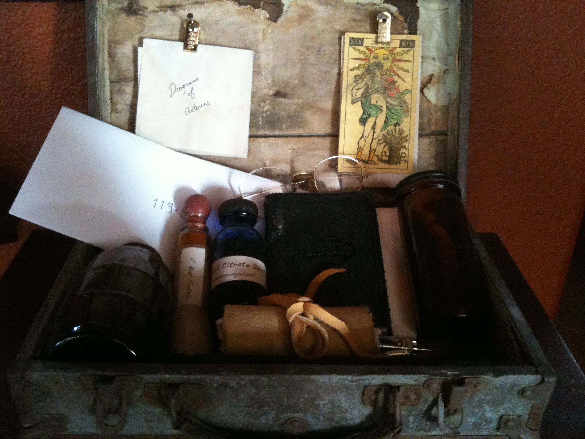 Okay, so this isn’t really “steampunk” per se, but I like it anyway. Mostly because I made it. It was a Christmas gift to my wife. I’ve seen so many kits for vampire slayers, that I wondered what a vampire would tote around. There are various chemicals to keep blood flowing, along with a syringe (these vamps might not have fangs). The best item is a jar with the remains of a bony finger and ash. All that’s left of said vampire.