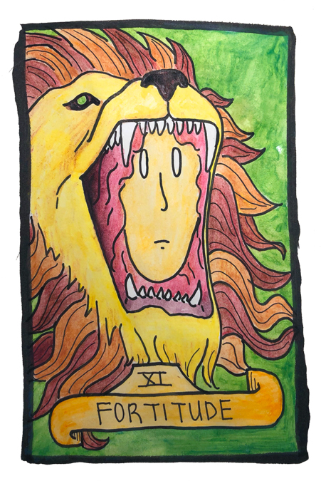 She shuffled through the Major Arcana until finding a blank one. The background showed a golden tapestry. Cut into it was an outline of where a person should have been. A lion with a long curly mane squatted next to the blank spot. The bottom read Fortitude.