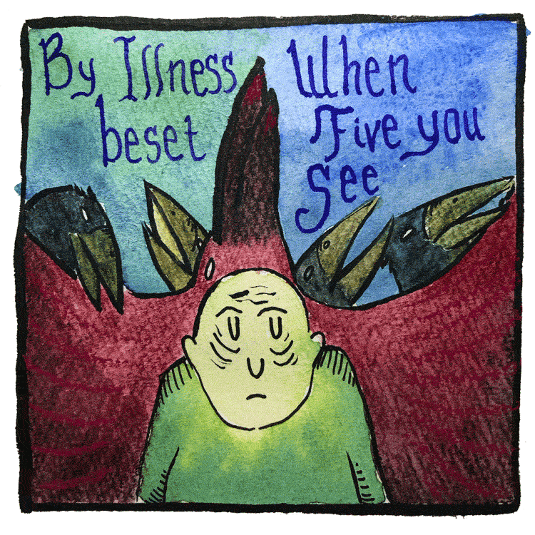 Five crows represents sickness. You or a family member might catch an illness or suffer mental distress.