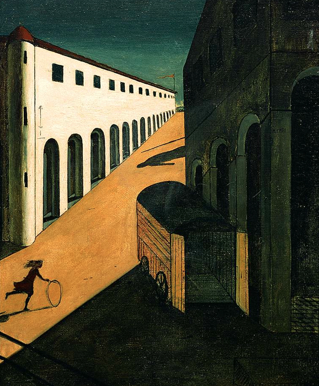 After settling in Florence, de Chirico traveled to Paris in 1911. There he met a number of avant-garde artists and writers, including Pablo Picasso and Constantin Brancusi. He also exhibited his work to the public. It was during this time (1911-15) that De Chirico created many of his most influential paintings such as “The Mystery and Melancholy of a Street” (1914). His paintings showed scenes with classical architecture where only a single lone figure or monument was present. Often long shadows hinted at other elements or figures just out of view. This creates an unsettling mood.