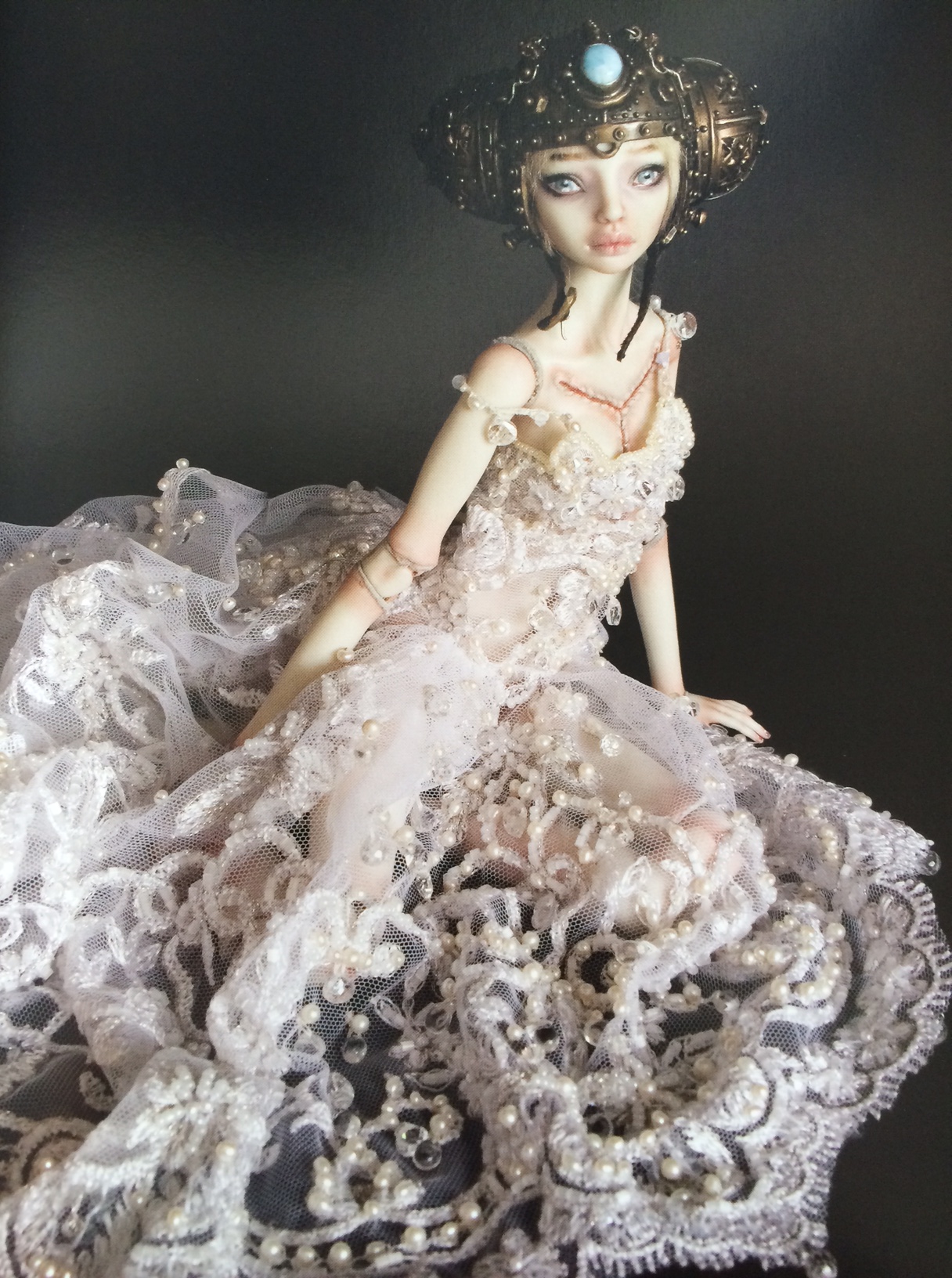Bychkova finds her inspiration for this doll from Mary Shelley’s Frankenstein, Camilla d’Errico’s Helmetgirls, and Erte’s conceptual fashion designs that appeared in Harper’s Bazaar magazine. Bychkova envisioned the “Bride” as a woman who went through so much high-voltage shenanigans, that her hair bleached white. She says: “Being electrocuted with several thousand volts of electricity destroyed all the pigmentation in her body, bleaching her once vivid complexion.” The Stempunk styled metal helmet helps pump oxygen to her brain and also adds some neural zapping to keep her thinking.