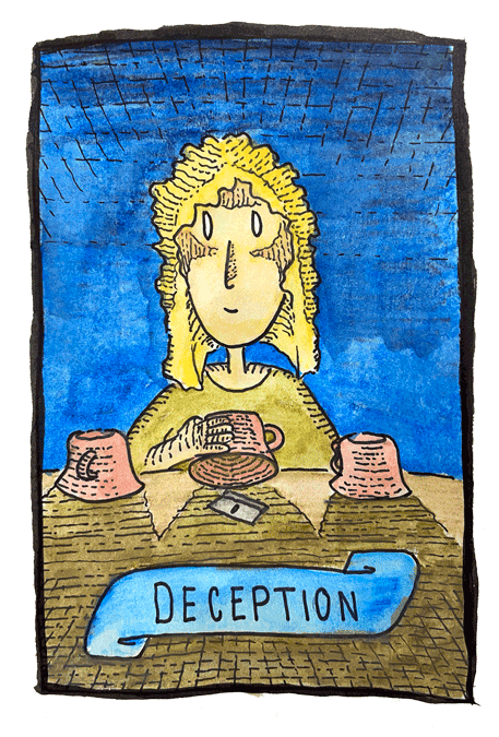 She turned away and mixed up the cups without looking. Maybe Kassandra could jumble them so even she couldn’t tell where the razor was hidden. Then it really would be a game of chance. But every time Kassandra slid the cup with the razor in it, it clinked on the ceramic side. Why had she chosen something metal to hide? So stupid.